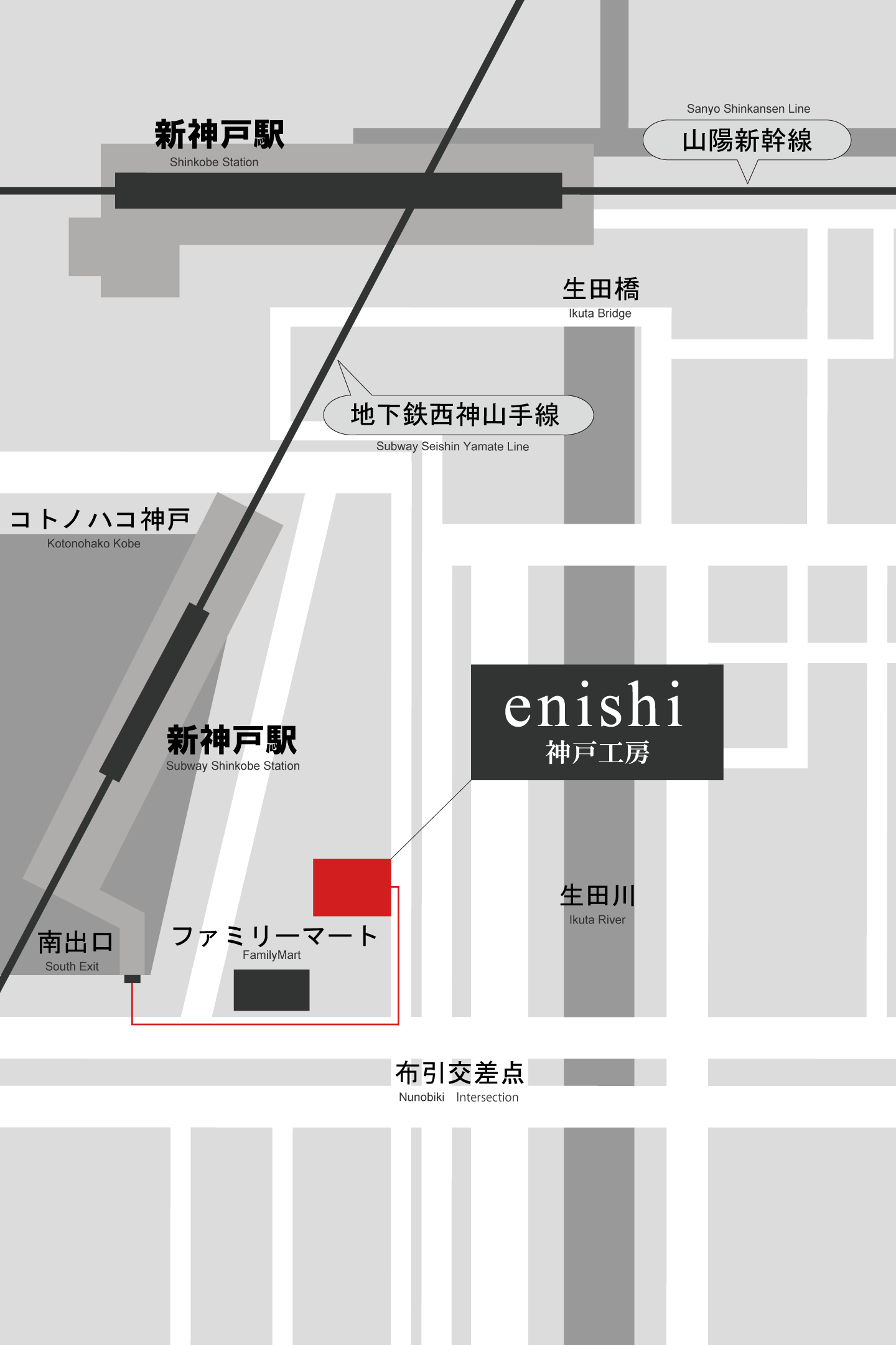 結婚指輪手作り.com enishi 神戸工房は、新幹線の新神戸駅から2分のところにあります。